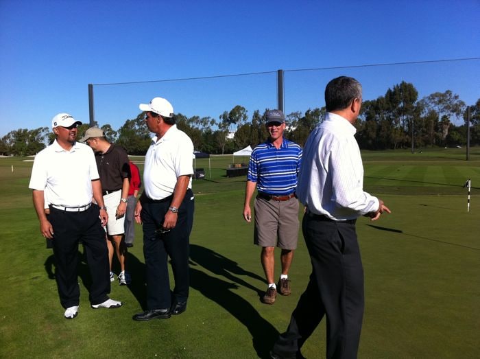 The Team Titleist members take their first look at the short game skills area.