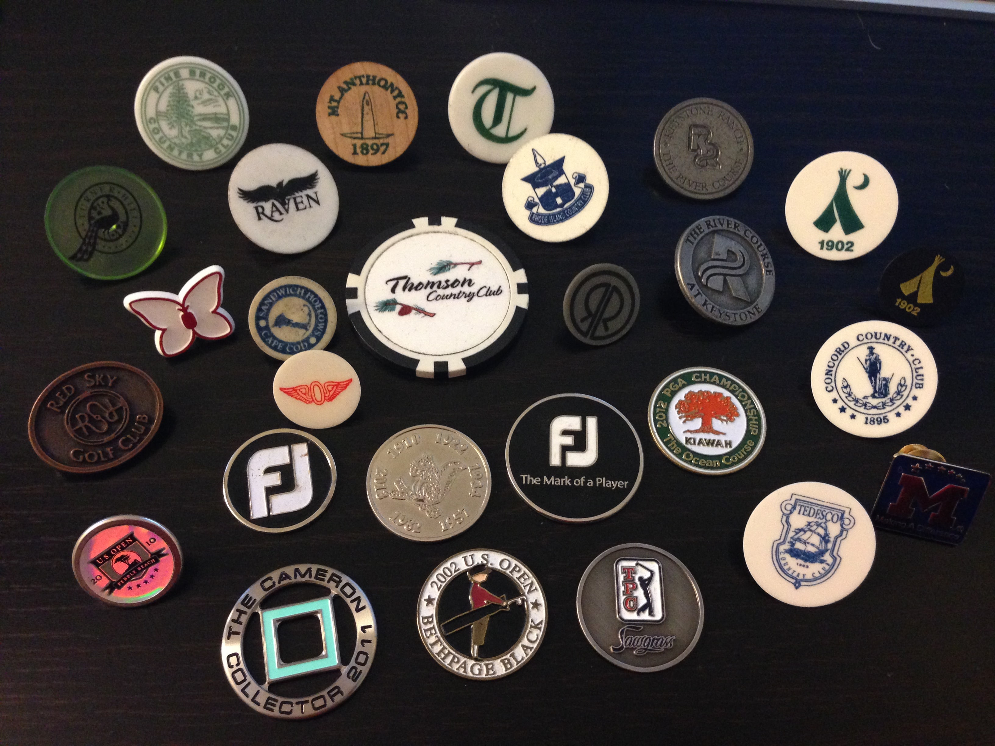 In addition to my FJ Ambassador marker, I have a few I cycle through.  For years, I used an Iraqi one dinar coin. It's large enough to see, has meaning for me (three TYD's in Baghdad), and is about the same diameter as the ball.  Recently, I've been using a BestGrips poker chip marker I received in a local outing (one of our members is the founder/owner of BestGrips).  When I do, I also carry a magnetic marker on the bill of my cap, so I have a smaller marker to use if I'm on or near someone else's line on the green.  Those rotate among the FJ Ambassador, a USGA handicap system, and a resort course marker.