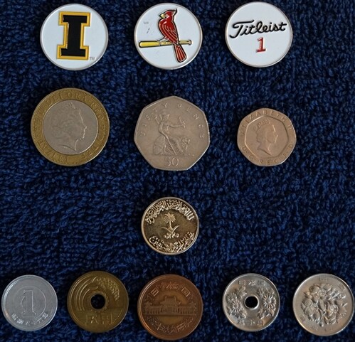 What I use depends on the bag I'm using.  The majority of the time I'm using my stand bag and with it I carry an Iowa Hawkeyes ball marker, STL Cardinals ball marker and a Titleist ball marker.  Whichever one I grab out of the bag is the one I'm using for that round.  When I go on golf trips (couple times a year) I take my cart bag and in it I have a bunch of foreign coins I picked up while traveling for work.