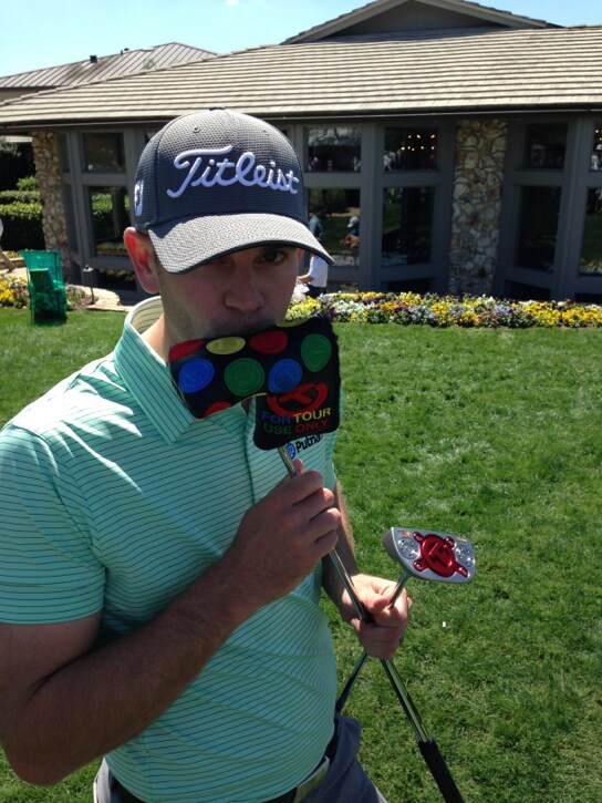 Brendan Steele swings by with a headcover "stache" before heading to the practice green.