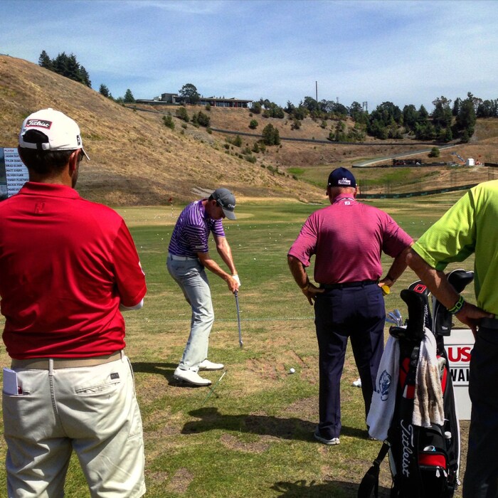 Just a few steps away, Jimmy Walker gets to work on the range under the watchful eye of Butch Harmon.