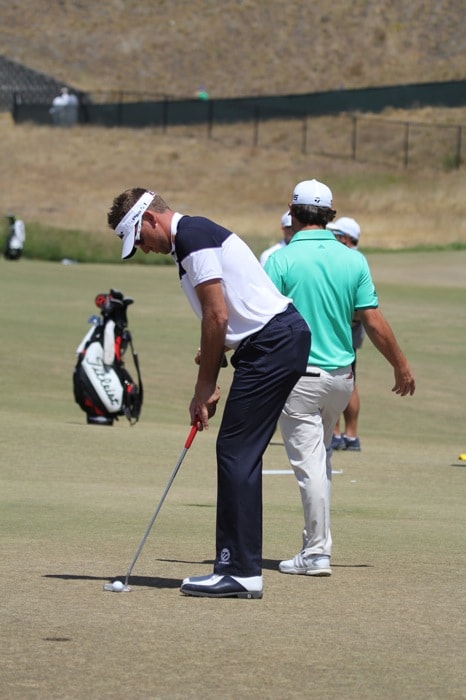 Just a few steps away, Ian Poulter was working on his putting stroke...