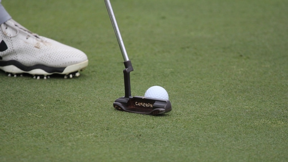 A close up of Jordan's Pro V1x and trusty Scotty Cameron putter.